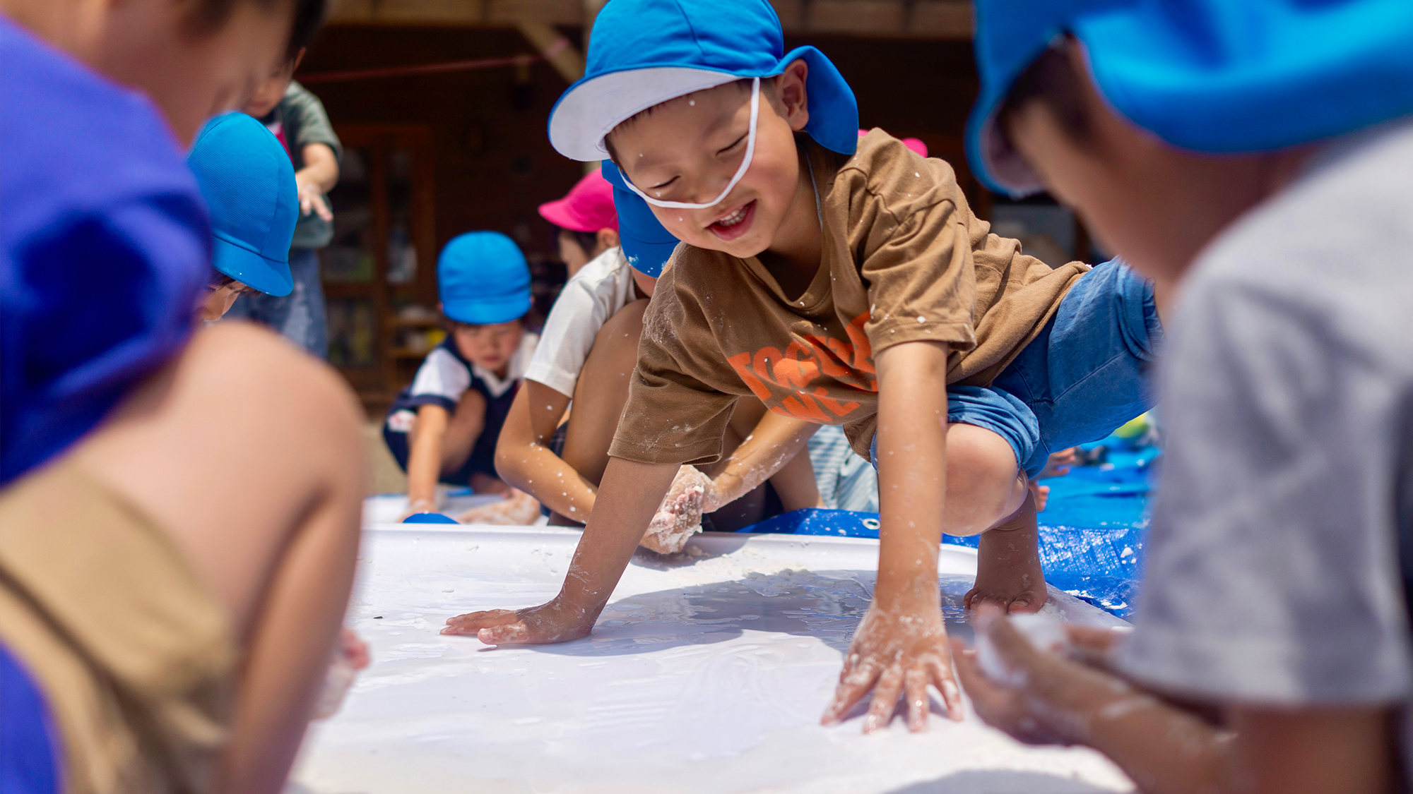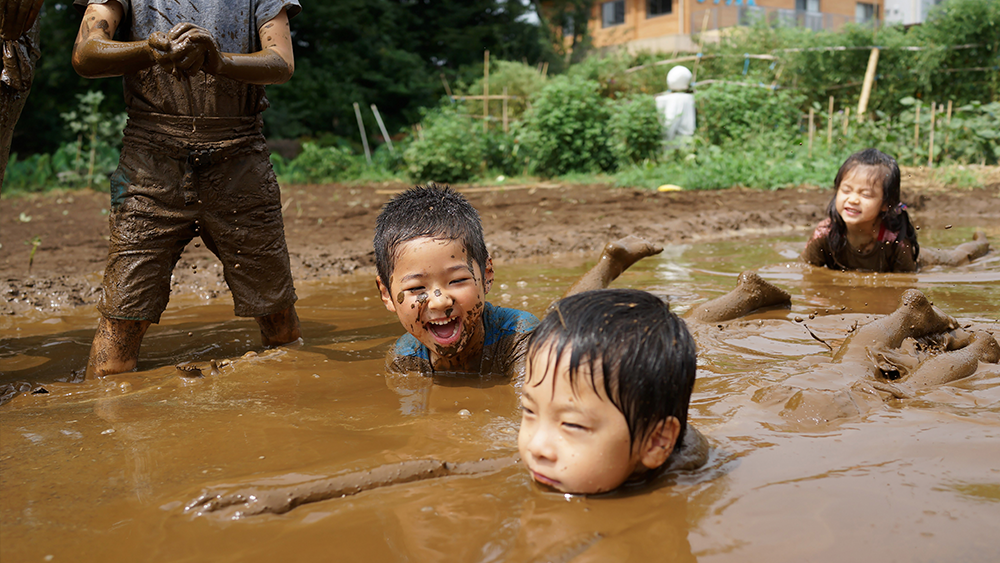 年に一度、のはら農園の畑に水をたっぷり入れた「どろんこプール」が出現。汚れてもいい服に着替え、五感を使って思い切り土と水の感触を味わう特別な日です。