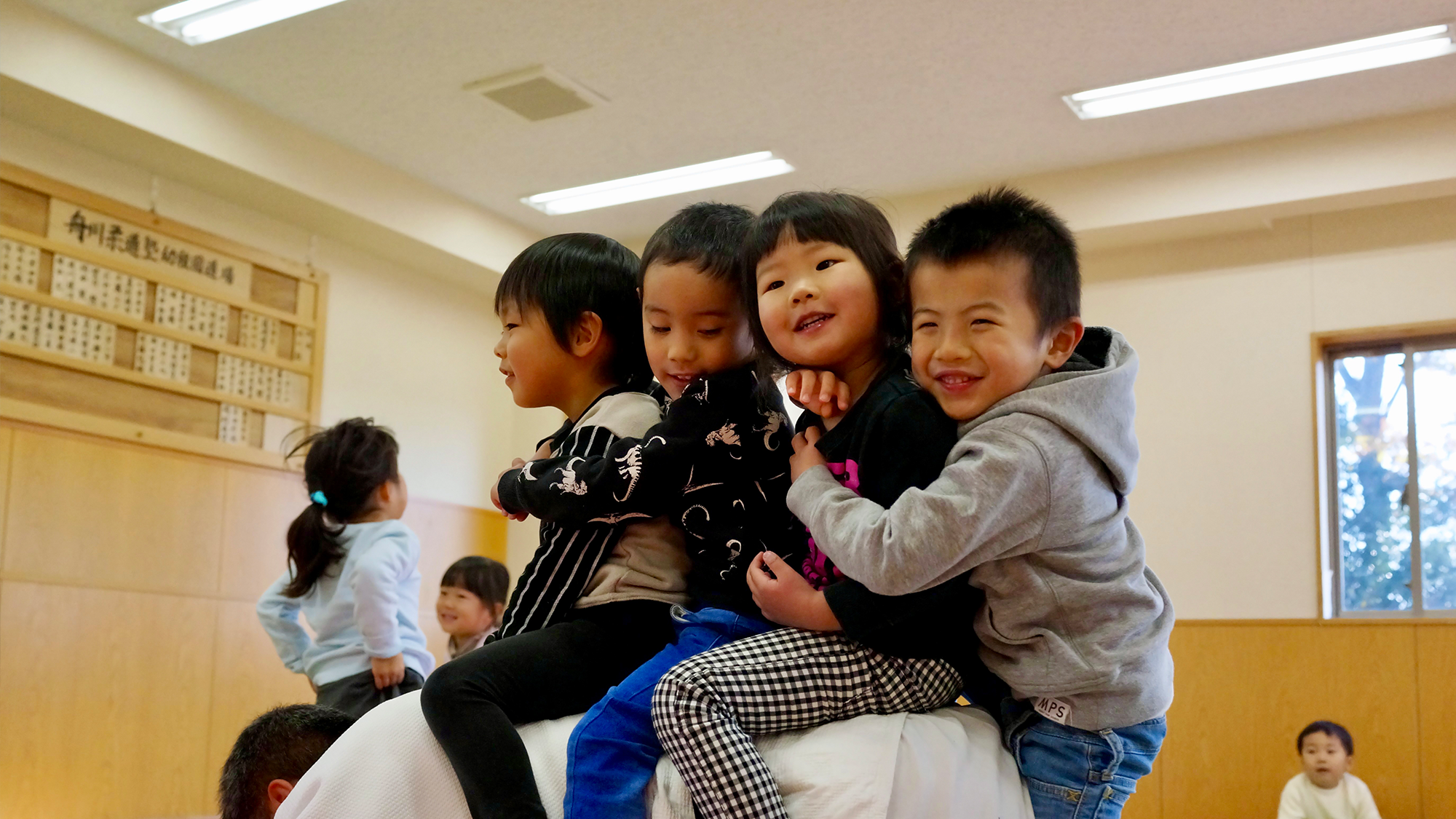 のはら幼稚園では理事長をはじめ男性職員が中心となり、30畳の畳のお部屋(柔道場)でお互いにいい汗をかきながら、じゃれつき遊びを楽しんでいます。