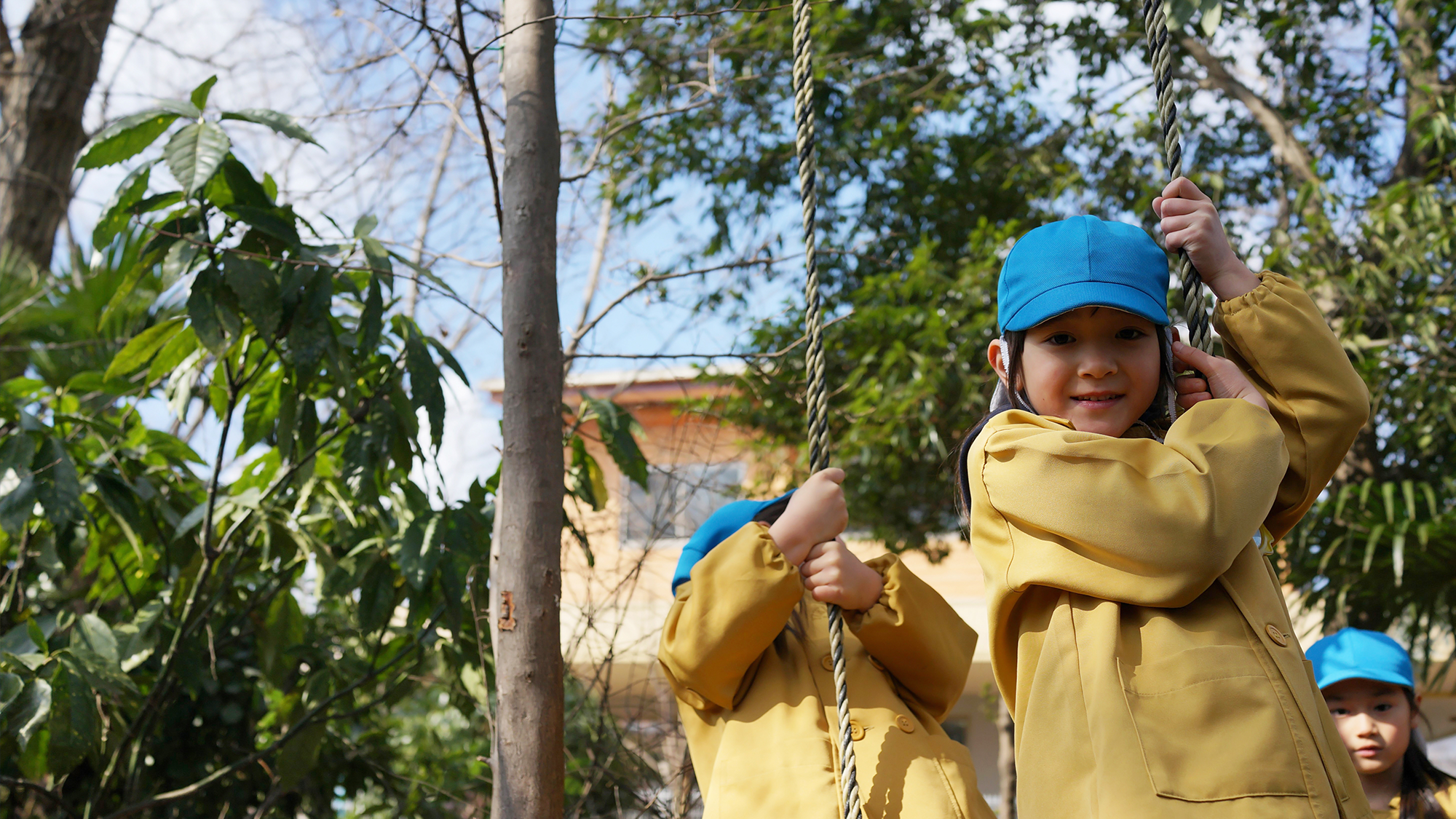 のはら幼稚園の隣には雑木林があり、手作りのアスレチックやブランコがあります。