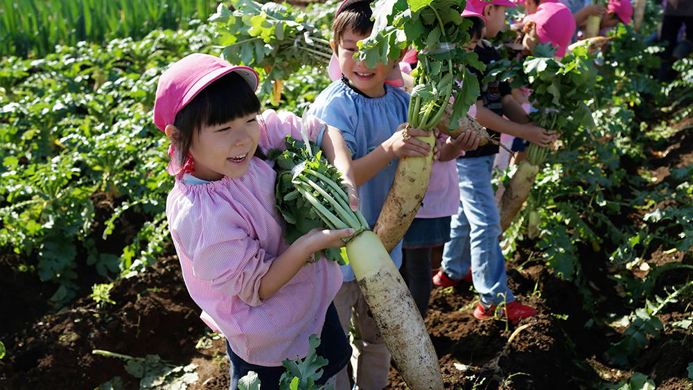 幼稚園の入り口の近くにある「のはら農園」で、毎年じゃがいも、大根、ミニトマト、きゅうり、ナスなどたくさんの野菜たちを栽培しています。